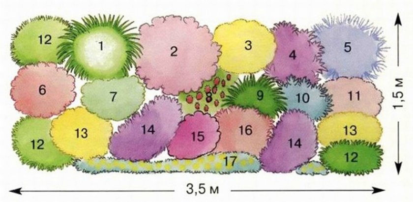 - Вариант с подбором по срокам цветения. Используется на полосе не меньше 3,5 м. Схема посадки не принципиальна, количество видов можно сокращать.