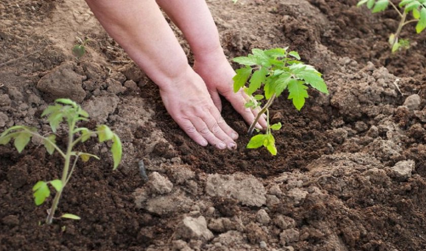 Почву под помидоры готовят еще осенью. Её перекапывают и обогащают органическими удобрениями. Это может быть компост, навоз, помёт, зола. Во взрыхлённом грунте выкапывают лунки, из расчёта 6 кустов на 1 м 2 , по схеме 40х50. Томат подвязывают к опоре, которую вкапывают возле каждого куста. Высадка в теплицы не имеет никаких отличий от открытого грунта, разница только в необходимости периодического проветривания растений.
