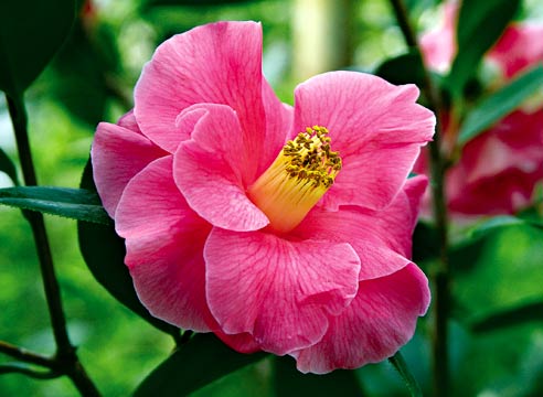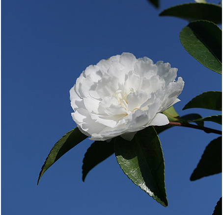 Камелия японская вечнозеленое деревце. Листья плотные, темно-зеленые, глянцевые, как бы лакированные, овальной формы, с заостренной верхушкой мелкопильчатым краем. Зимой на концах молодых побегов распускаются очень красивые красные, розовые или белые цветки: лепестки их плотные, похожи на восковые. Цветки махровых сортов очень напоминают розы, но лишены запаха. Цветение продолжительное. Известно более тысячи сортов и садовых форм камелии, цветки которых варьируют по размерам (от 4,5 до 15 см).