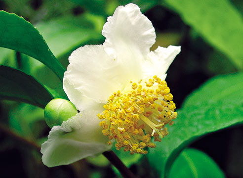 Вечнозелёный кустарник до 10 м высотой выращивают на просторах горных регионов Китая и вблизи рек. Цветёт такая камелия крупными белыми цветками в сентябре-октябре. Выращивают её не ради красоты, а чтобы получать ценное масло камелии из семян растения.