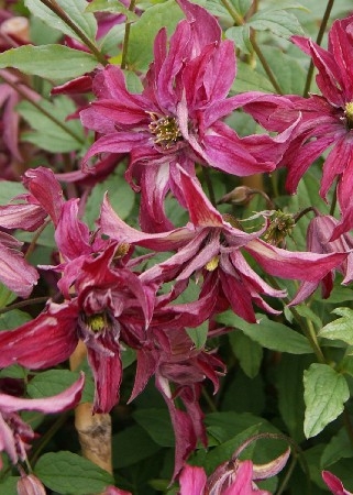 Клематис Розалин выносливая лиана со стеблями до 2 м длиной. Листья перистые бледно-зеленого цвета. Цветы расположены в вертикальном положении, кивая соцветиями, 4 см в диаметре, полумахровые красно-фиолетовые. Период цветения с июня до сентября. Обрезка на 25 см выше уровня почвы. Выращивают в открытом грунте.
