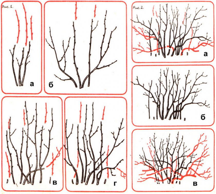 Рис.1. Обрезка смородины: а – однолетнего саженца; б – двулетнего куста; в,г – укорачивание побегов. Рис.2. Куст смородины до омолаживающей обрезки (а), после неё (б) и обрезка запущенного куста (в).