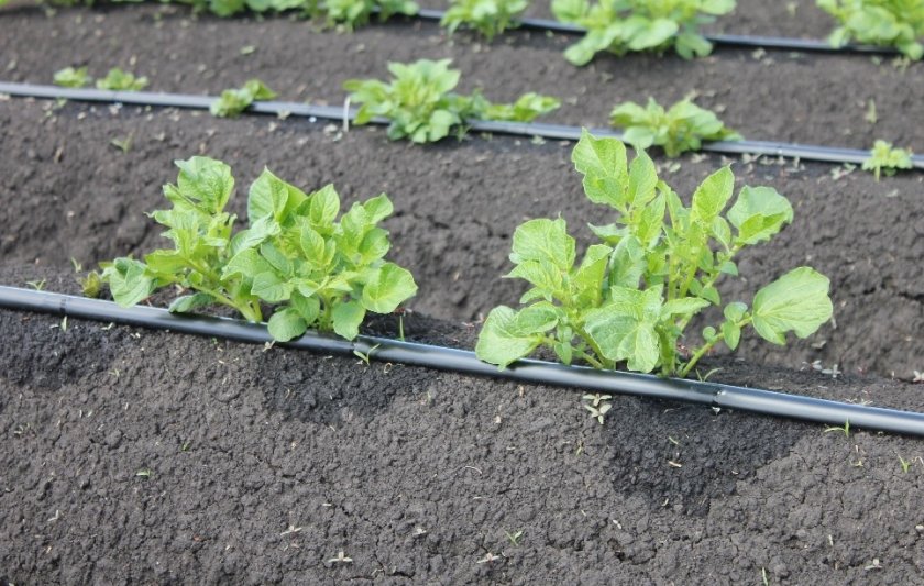 Увлажнение проводят по мере высыхания почвы. Своевременный полив снизит количество мелких клубней и увеличит число товарного картофеля. Для качественного увлажнения почвы рекомендуется использование капельной системы.