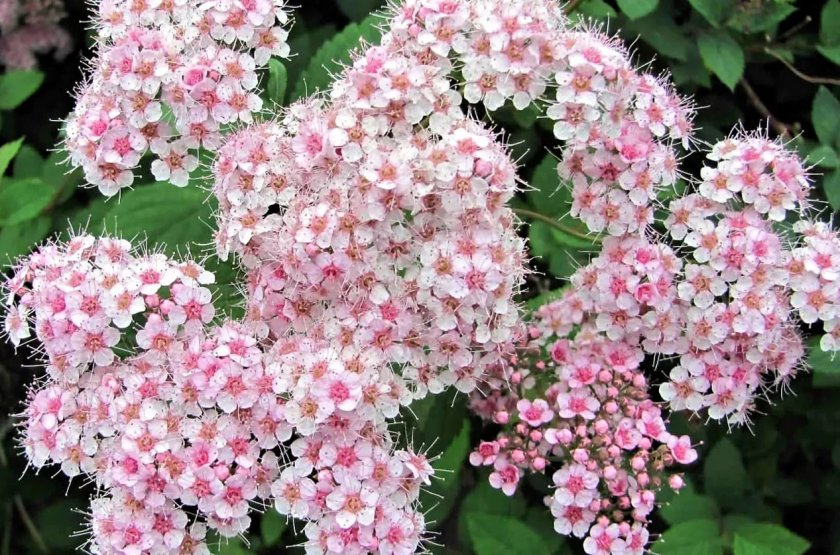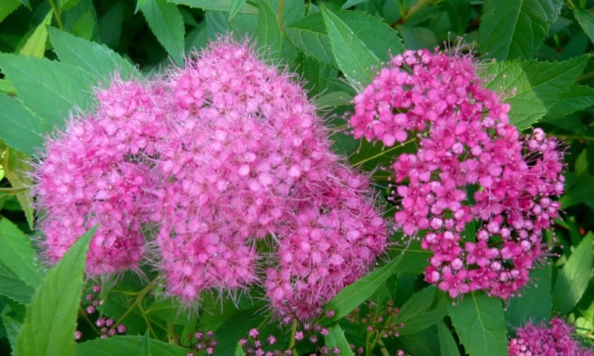 Соцветия у таких растений вырастают на вершинах молоденьких побегов. Старые побеги, оставшиеся с того года, со временем усыхают. Сорта спиреи японской представляют большую часть летнецветущих. Чаще всего цветочки имеют розовый окрас, но могут быть розовато-красными либо красными. Наиболее популярные виды: