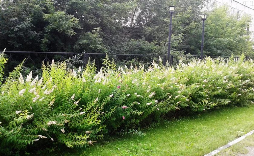 Изгородь из серой спиреи сорта Грефшейм весеннего срока цветения
