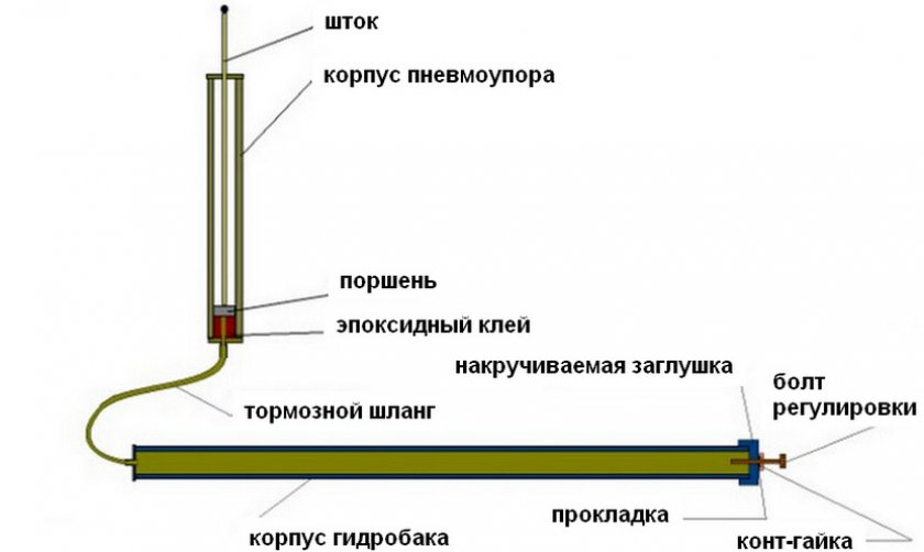 - Взять автомобильный гидроцилиндр или соорудить этот элемент самостоятельно, используя лист, изготовленный из перечисленных выше материалов.