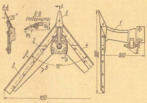 Стойки лап крепят на грядилях 8, шарнирно присоединенных к брусу рамы. Стрельчатые лапы располагают в шахматном порядке в двух рядах (рис. 1, в).