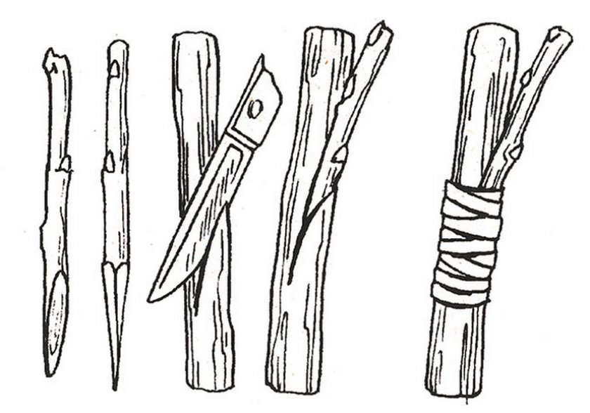На срезанной ветке выполняется продольный надрез в глубину до 5 см. Черенок надрезается с двух сторон, он должен напоминать клин. Затем привой вставляется в расщеп до упора, обвязывается ветка плотно, закрепляется, потом обработать варом.