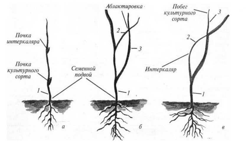 Получение саженца с интеркалярным подвоем за три года: а) первый год – двойная окулировка; б) второй год – прививка сближением; в) третий год – удаление части культурного сорта и верхушки интеркалярного подвоя.