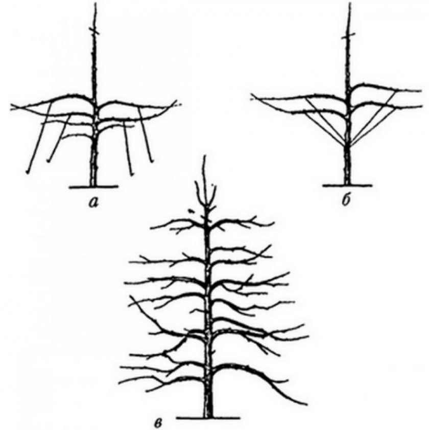 Выше уровня штамба на 25–30 см отмечают высоту расположения первого яруса, в котором оставляют 1 ветку. Все боковые ветки над ним удаляют. На следующий год формируют второй ярус (из двух веток) на 15–20 см над первым. Оставшиеся в двух ярусах три ветви должны быть одинаковыми по длине и смотреть в разные стороны, чтобы крона была равномерной. Все конкурирующие побеги нужно удалить. Ещё через год на 40 см выше второго образуют третий ярус (он может состоять из 1 ветки). На этом формирование кроны заканчивается. Нужно только поддерживать получившуюся форму и общую высоту дерева (не позволяйте яблоне превышать отметку 2,5 м) за счёт укорачивания ствола. Для сильнорослых сортов можно перевести лидирующий проводник на боковую ветку на высоте 2–2,5 м.