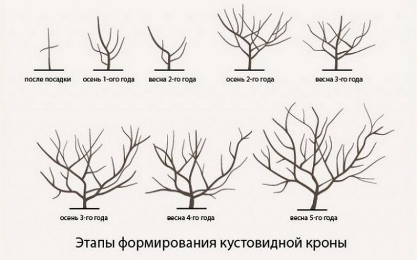 Разреженно-ярусная крона формируется за 4–5 лет, при этом каждый год садовод должен выполнять корректирующую обрезку веток