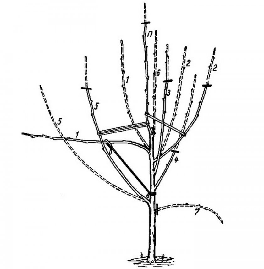 На иллюстрации представлены основные приёмы формирования кроны: 1 — отгибание сильной ветви, не нужной для формирования остова кроны; 2 — увеличение угла отхождения и подрезка ветки, используемой в качестве основной; 3 — слабое укорачивание для соподчинения проводнику (П); 4 — сильное укорачивание для превращения ветки в обрастающую; 5 — подтягивание отлогой скелетной ветки для усиления роста; 6 — вырезка конкурента проводника; 7 — вырезка свисающей ветви, мешающей обработке почвы