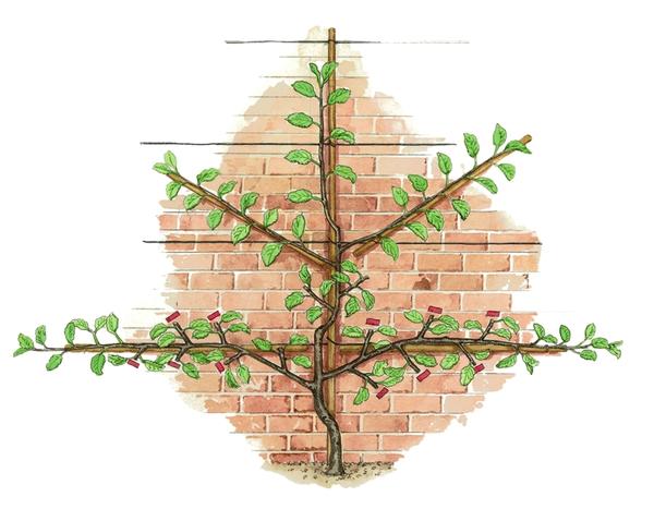 Сразу после посадки укорачивают центральный проводник до необходимой высоты. Спустя год после посадки, 2 ветки, которые растут на высоте 50–60 см, закрепляют на нижний уровень шпалеры под углом 90°. В дальнейшем все растущие на них ветки укорачивают до 15 см. Через год формируют второй ярус веток, которые закрепляют на соответствующем участке шпалеры. Все остальные побеги, кроме оставленных 4 и центрального проводника, вырезают на кольцо.