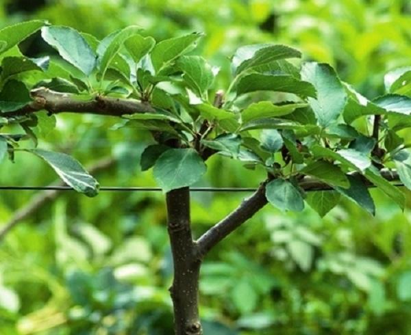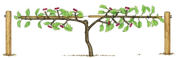 Горизонтальный двуплечий кордон — две ветви направляют в разные стороны горизонтально и подвязывают к туго натянутой проволоке. Появляющиеся затем боковые побеги укорачивают.